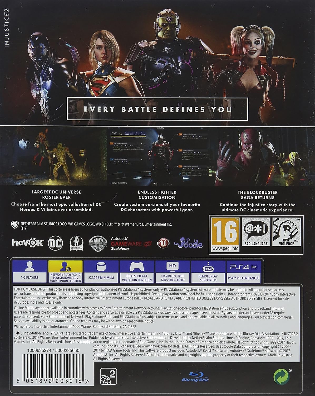 • Epic, Cinematic Storyline: Injustice 2 continues the story set in motion in Injustice: Gods Among Us as Batman and his allies work towards putting the pieces of society back together, but struggle against those who would restore Superman’s Regime. In the midst of this chaos, a new threat appears that will put Earth’s very existence at risk.