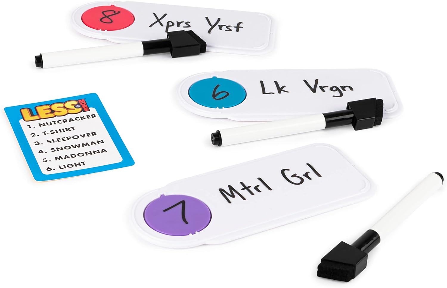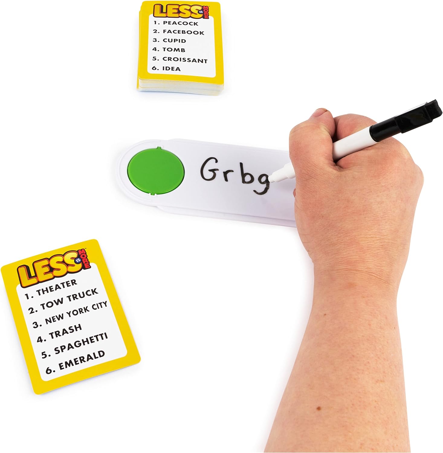 GUESS BETTER WITH LESS LETTERS: Try to get a player to guess a word with clues using as few letters as possible. Players race to write their clues. The fewer the guesses, the more points...