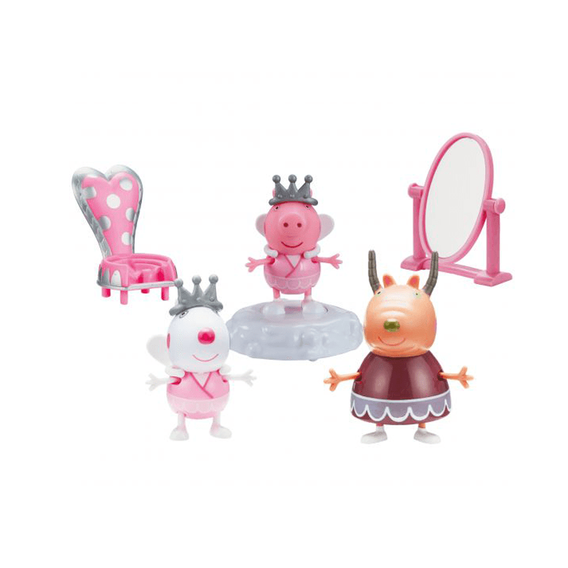 Peppa loves ballet dancing lessons with Madame Gazelle and her friend Suzy Sheep! This playset includes 3 figures in exclusive ballet costumes. Peppa and Suzy are complete with tiara's and fairy wings, ready for their ballet performance! Includes a mirror and throne, as well as a magical dance cloud that spins back and forward. Watch as Peppa twirls and dances away! Scaled for play with other Peppa Pig figures, vehicles and playsets, and perfect for encouraging imaginative play and story-telling. Suitable for ages 3 years and over.