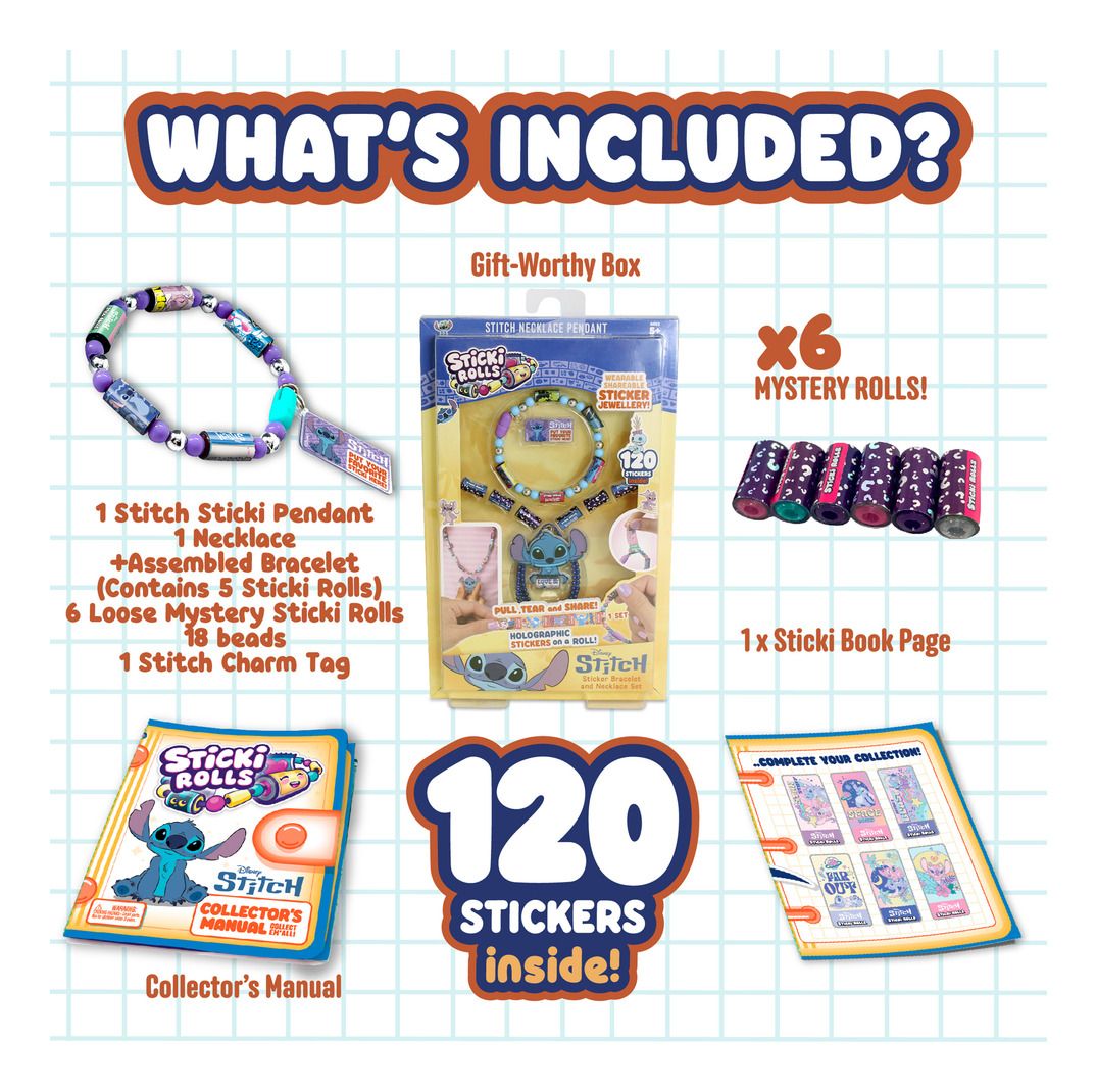 Exclusive Stitch Designs: Featuring collectable Stitch Sticki Rolls depicting Stitch’s playful personality and tropical adventures in Hawaii! Wearable Jewellery: Includes a stylish bracelet and pendant for a fun and fashionable way to carry your stickers....