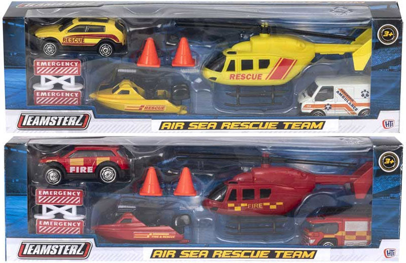 Get ready for your very own rescue missions at sea with the Teamsterz Air Sea Rescue Team playset. The playset includes a highly detailed die-cast helicopter with manually rotating propeller blades, emergency vehicle, 4x4 vehicle with tow bar, plastic boa