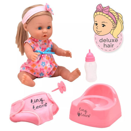 The Tiny Tears Classic Doll is 38cm high and features her iconic golden hair. She wears a pretty flower print dress and a cute headband. The original drinking, crying and wetting doll. DRINKS & WETS:...