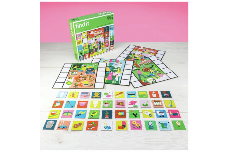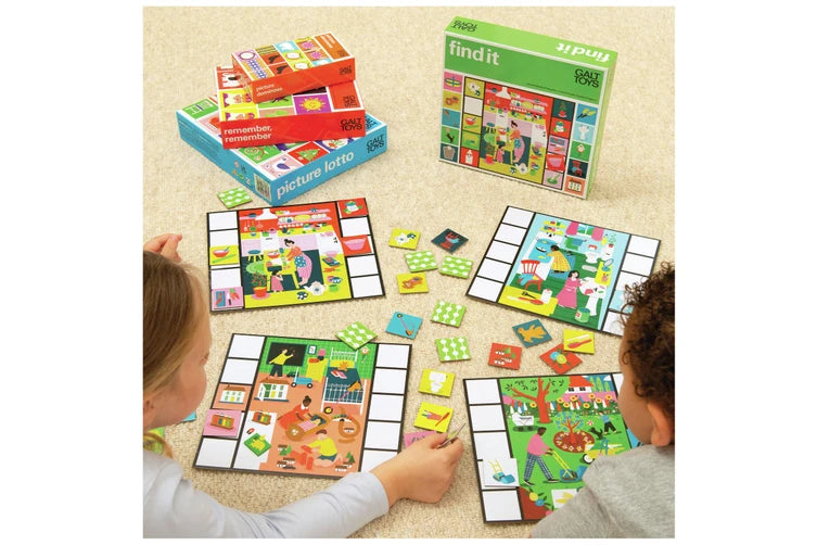 Based on the beloved Galt classic, Find It is a fun and vibrant advanced lotto game. First, a player picks up a card and describes the object they see, and then everyone must search for the matching item in the colourful scene on their playing board. Be the first player to collect all the cards that match your board to win!