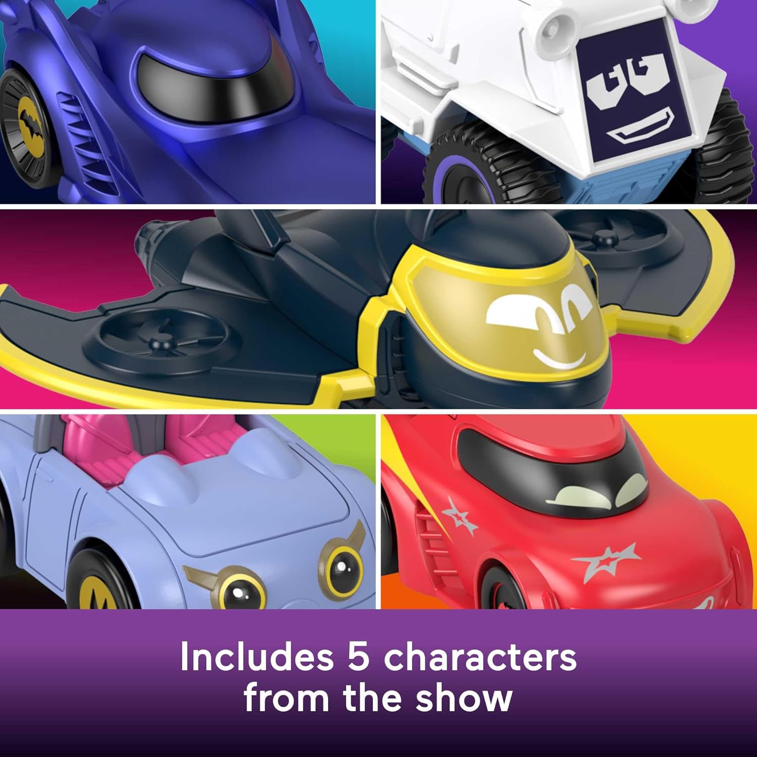 Diecast vehicle pack featuring Batwheels characters in 1:55 scale Batcast Metal diecast format Includes 5 diecast metal vehicles, including Bam the Batmobile, Redbird, Kitty, Snowy and Batwing Working wheels: Push to send characters racing into...