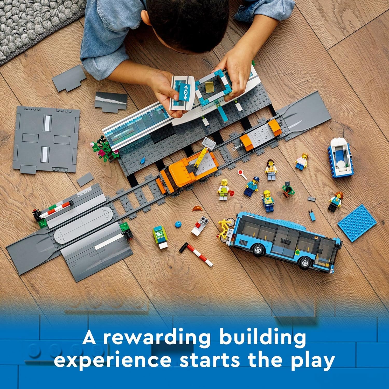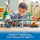 This toy train station set features a bus, road and rail truck toy, trailer, portable toilet, LEGO Road-Plate level crossing and 6 minifigures Includes Road Plate level crossing for connection to other LEGO City sets...