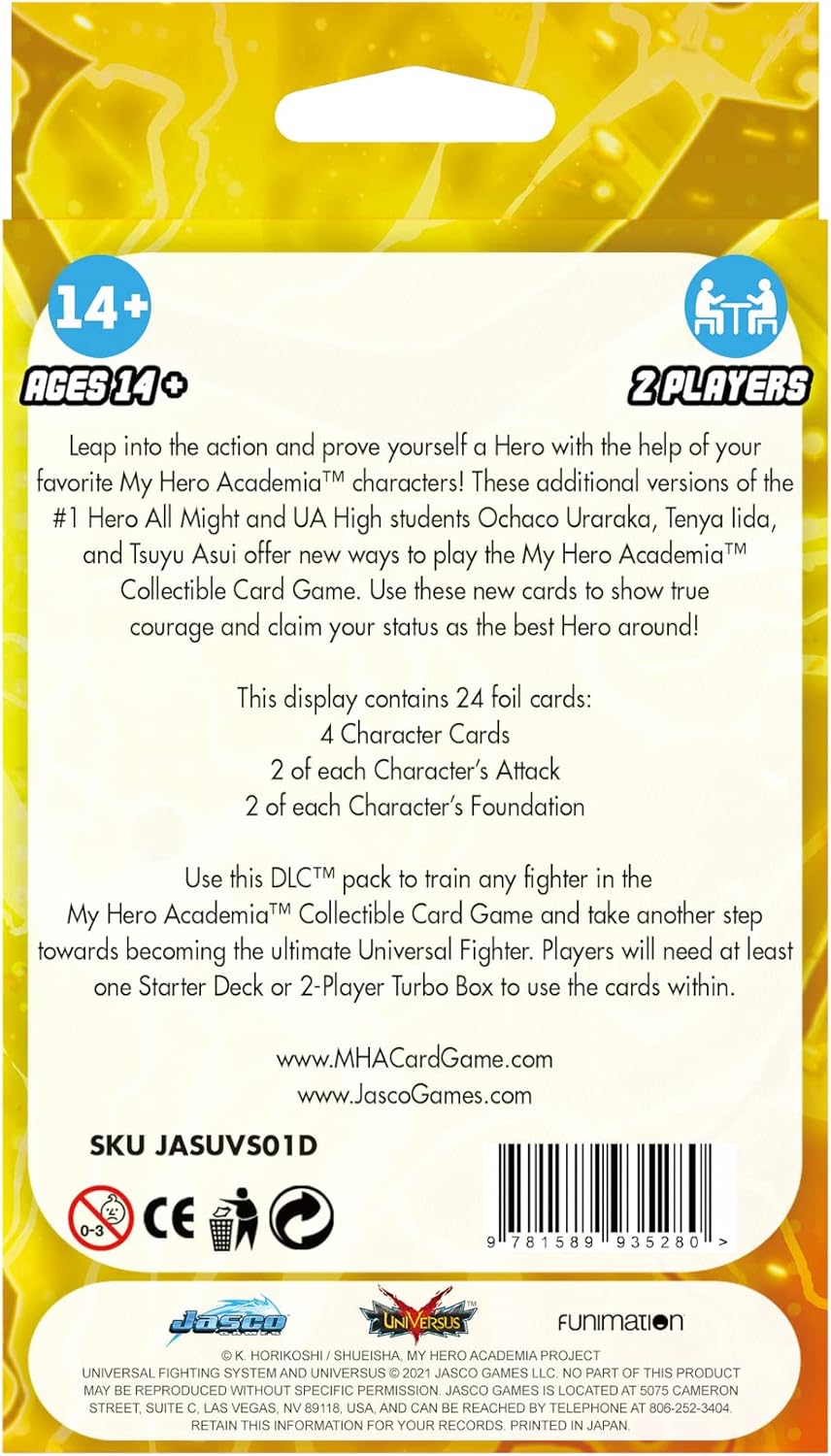 • EXPAND YOUR COLLECTION: This DLC includes new Character Cards for All Might, TenyaIida, Ochaco Uraraka, and Tsuyu Asui! This pack contains 20 foils cards which includes 4 Character Cards, 2 of each Character's Attacks and 2 of each Character's Foundations. New attack and foundation cards allow for even more deck variety.