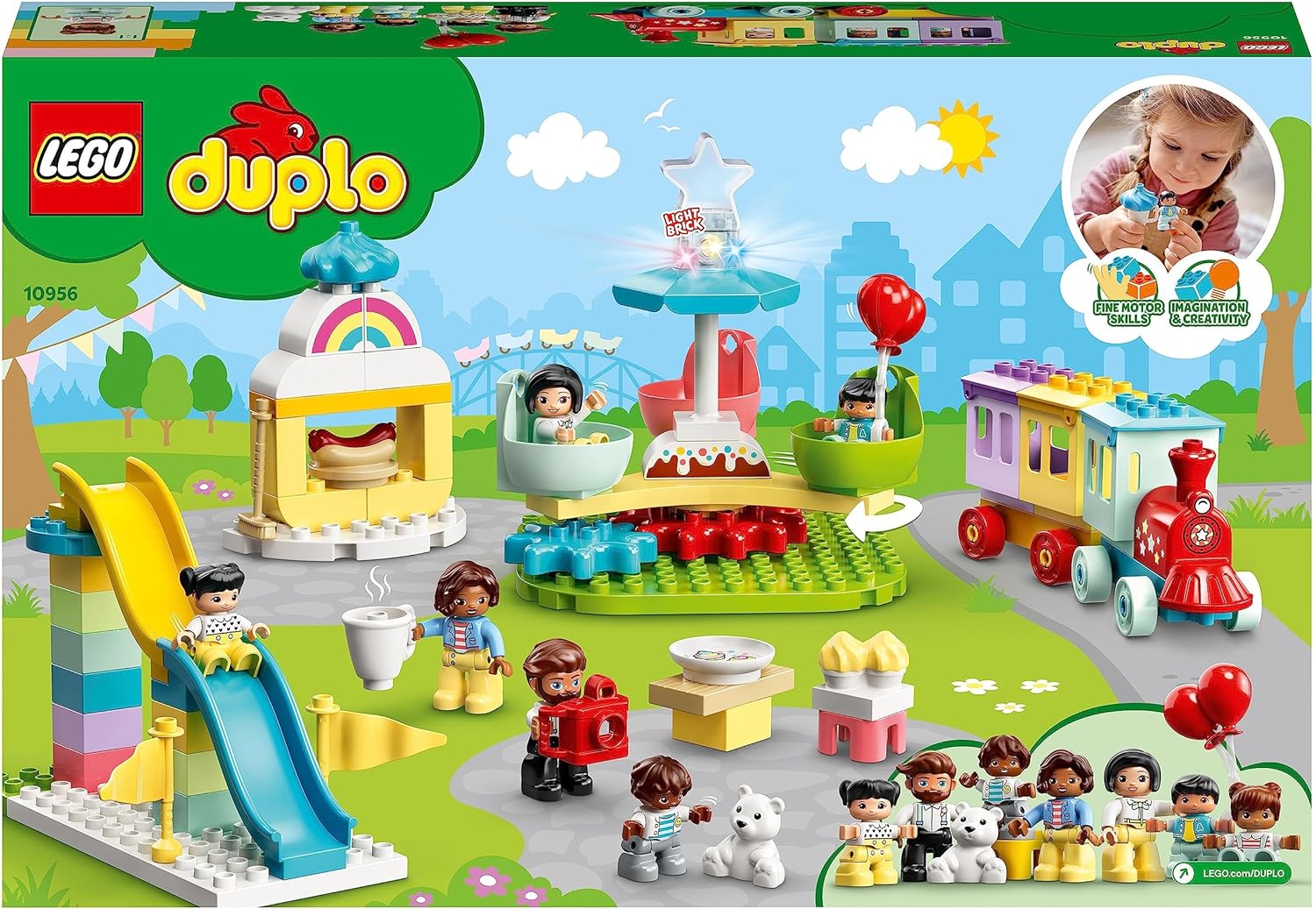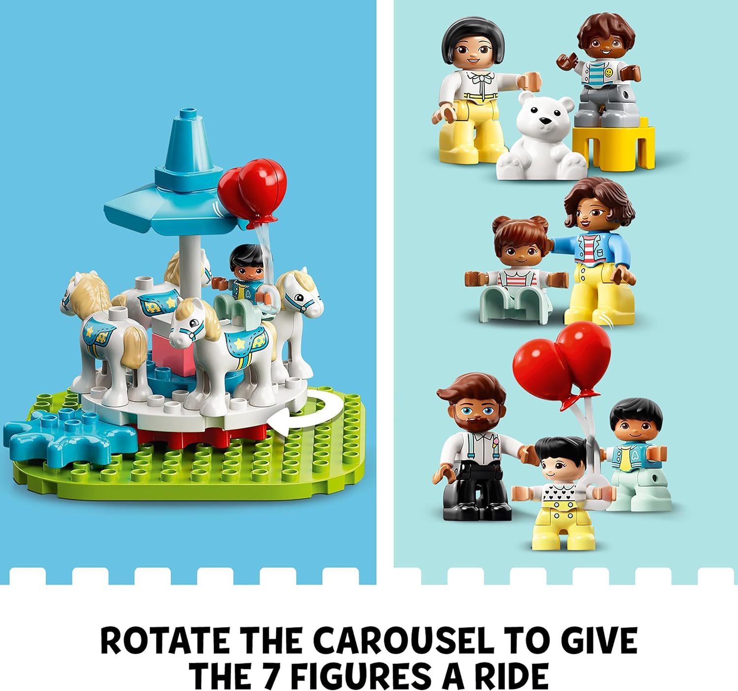 The LEGO fairground toy for toddlers 2+ years old features 2 slides, a mechanical carousel, and a turning Ferris wheel with 3 colourful cabins Also features a push-along LEGO DUPLO train and accessories such as...