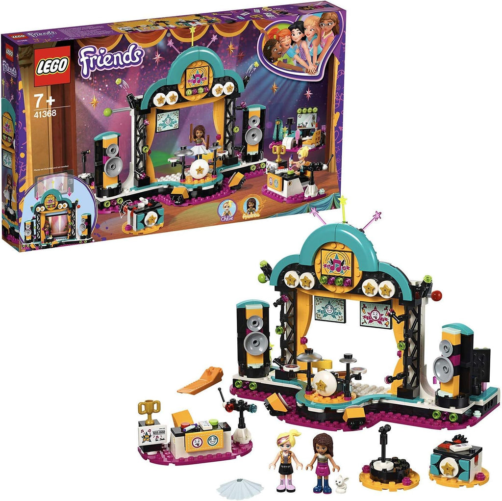 Includes 2 mini-doll figures: Andrea and LEGO Friends Chloe, plus a rabbit figure. Features a main stage with rotating speakers, plus 3 separate rotating mini sets, 2 backstage areas, a judging panel with flag functions...