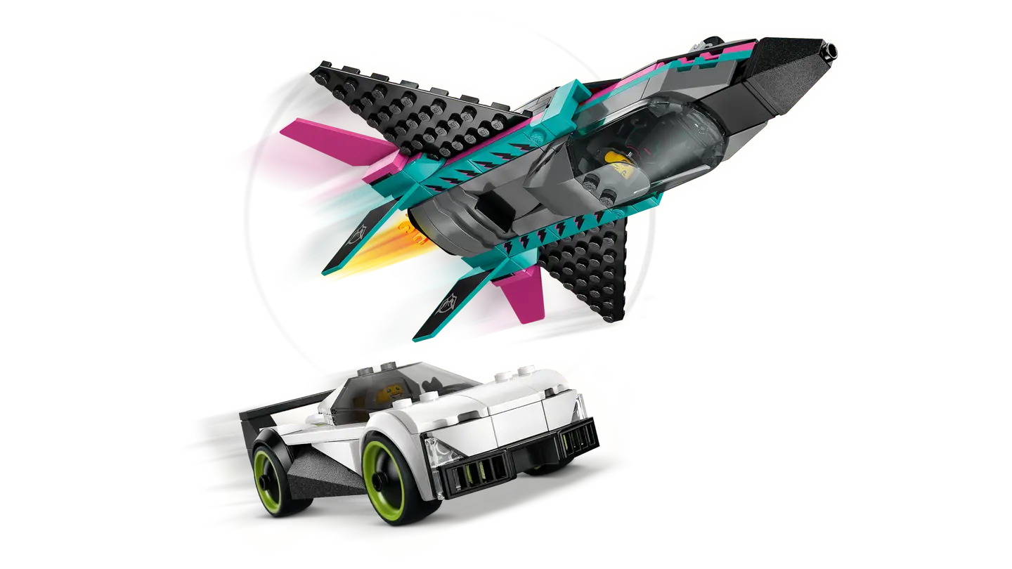This double-feature LEGO® City Jet vs. Car (60489) vehicle toys playset includes a sleek supercar and a supersonic jet for imaginative racing fun. The toy jet features swept-back wings, twin vertical fins and stabilizers. Kids can slide a lever toengage the jet’s afterburners and open the cockpit of the supercar to access the detailed interior, complete with a racing seat. Just add the pilot and race driver minifigures for hours of epic race action. Make any day special with this jet and car bu ilding kit – a great gift for 6-year-old boys, girls and kids who love race car toys and model aircraft. Add this set to others (sold separately) from the LEGO City range for citywide action. Make this LEGO vehicles sports car and jet plane toy playset even more fun with the LEGO Builder app, where kids can zoom in, rotate models in 3D, and track their building progress. Set contains 259 pieces.