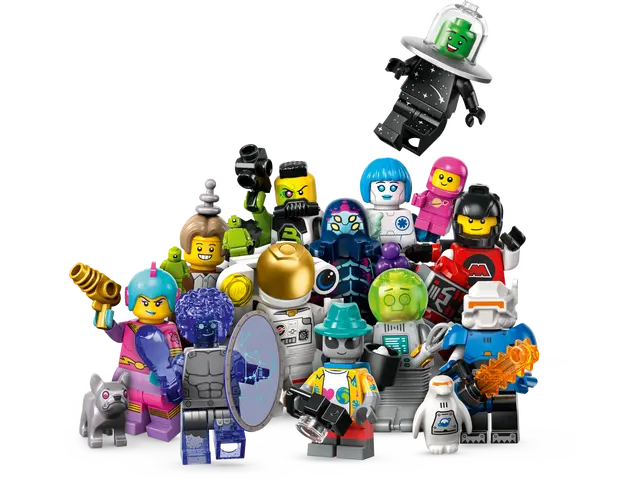 There is 1 surprise LEGO space minifigure in each box and a total of 12 characters to collect: Blacktron Mutant, Ice Planet Explorer, Imposter, Robot Butler, Alien Beetlezoid, Retro Space Heroine, Nurse Android, Flying Saucer Costume Fan, M-Tron Powerlifter, Alien Tourist, Orion and Spacewalking Astronaut.