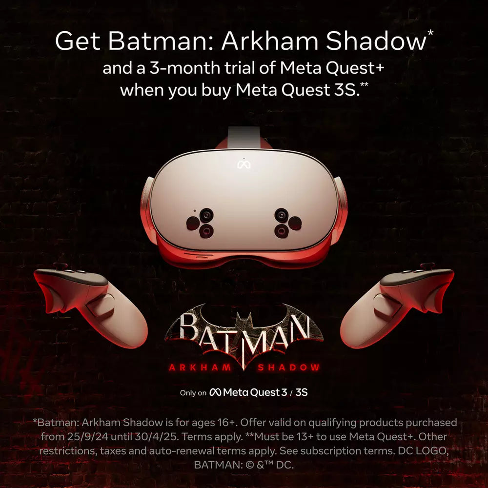 Transform your reality and do everything you love in totally new ways. Welcome to Meta Quest 3S. Now you can get Batman: Arkham Shadow and a three-month trial of Meta Quest+ (a combined £60 value) with purchase.
