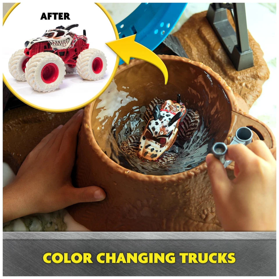 • ALL-IN-ONE MONSTER JAM PLAYSET: Launch and dunk to colour change your 1:64 scale exclusive Mud Blasters Monster Mutt Dalmatian truck with the full stunt Mud Blasters Playset