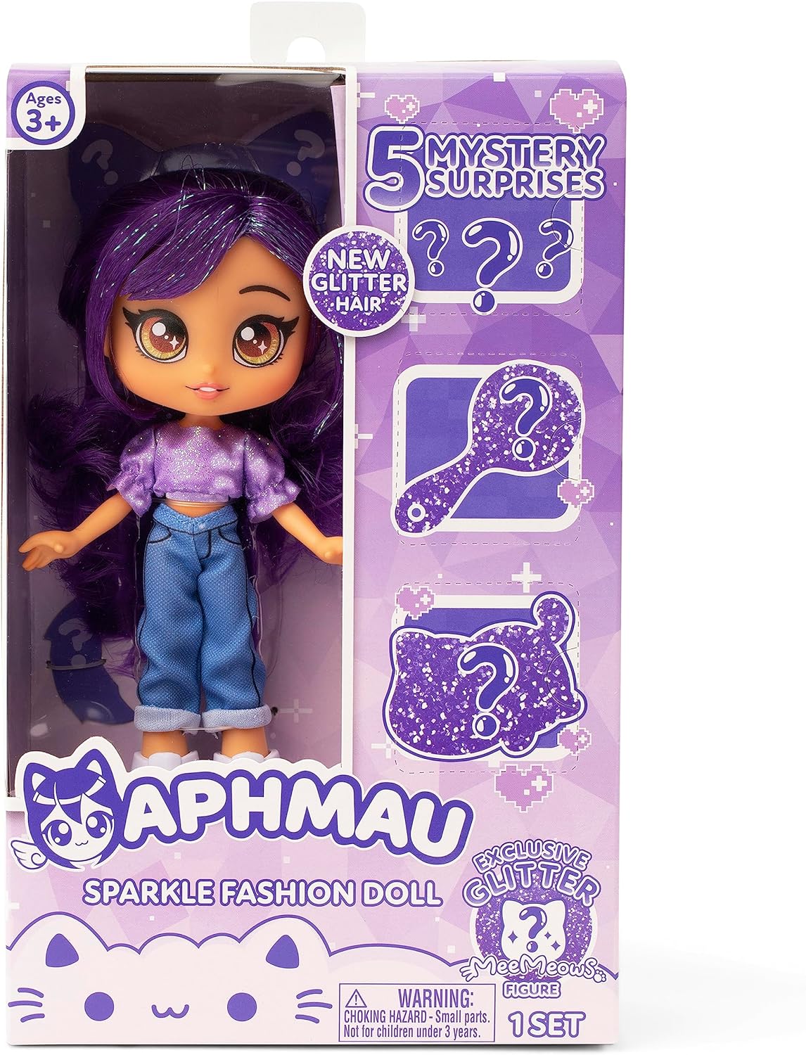 Aphmau, the mega star female gamer and YouTube Creator, is known for her love of cats and her collection of adorable MeeMeows! A sparkly new Aphmau doll is here and she’s ready to shine and shimmer! The all new Aphmau Sparkle Doll features new sparkly hair, glitter fashion outfits and sparkly accessories! Aphmau wouldn’t be complete without her favourite feline friends! Unbox one exclusive mystery glitter MeeMeow mini figure included inside every package of the Sparkle Fashion Doll. Doll includes awesome surprises for you to uncover, including a glitter MeeMeow figure, sparkly cat ears, sparkly cat tail, and hairbrush. The Aphmau toy line is expanding, and feline fashion has never looked better! This fashion doll is officially licensed Aphmau merch!