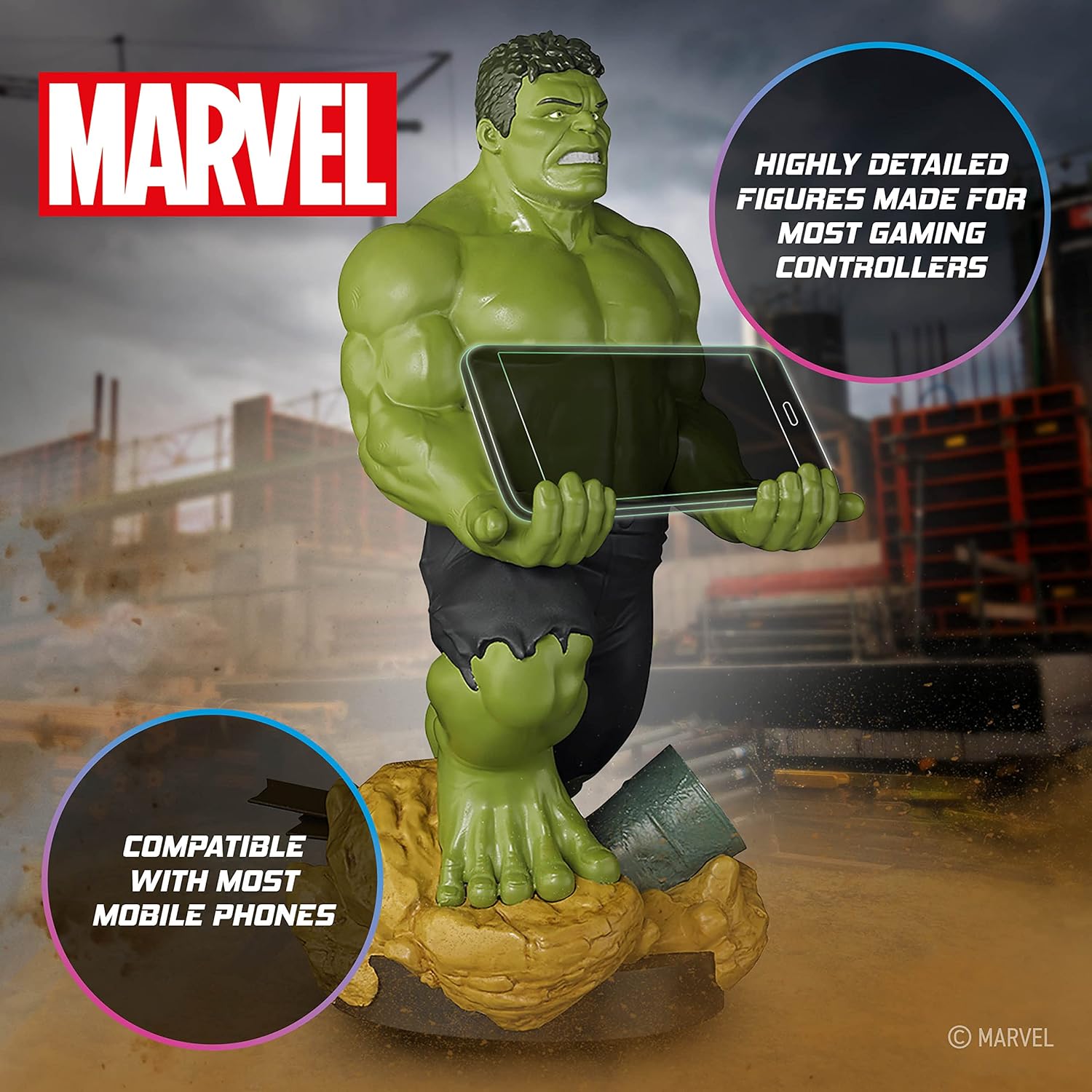 Compatible with most PlayStation, X-Box, Switch & retro console controllers Holds all mobile phone devices Includes 2m (6ft) micro USB charging cable Styled on "Hulk" from the Marvel franchise Official licensed merchandise
