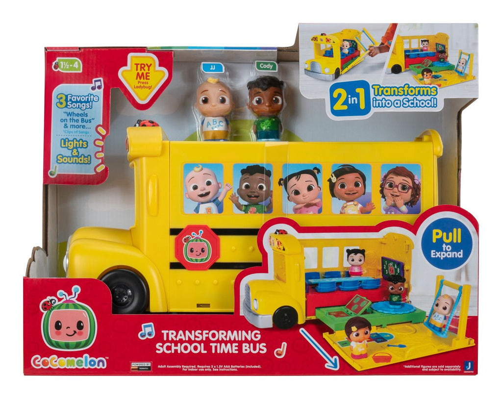 2-In-1 SCHOOL BUS: The CoComelon Transforming School Time Bus is a unique 2-in-1 bus that transforms into a school.#(cr)3 FAVOURITE SONGS: This toy features fan-favourite song clips like "Wheels on the Bus," "First Day of School," and the "ABC Song”.#(cr)LIGHTS AND SOUNDS: Press the ladybug to activate lights and sounds.#(cr)6 AREAS TO PLAY: Open the toy bus and get ready for school – explore the garden with Cody, push JJ on the swings, play on the playground, and more.#(cr)MORE TO COLLECT: Experience the excitement of CoComelon at home with a wide selection of toys, plush, instruments, and more.