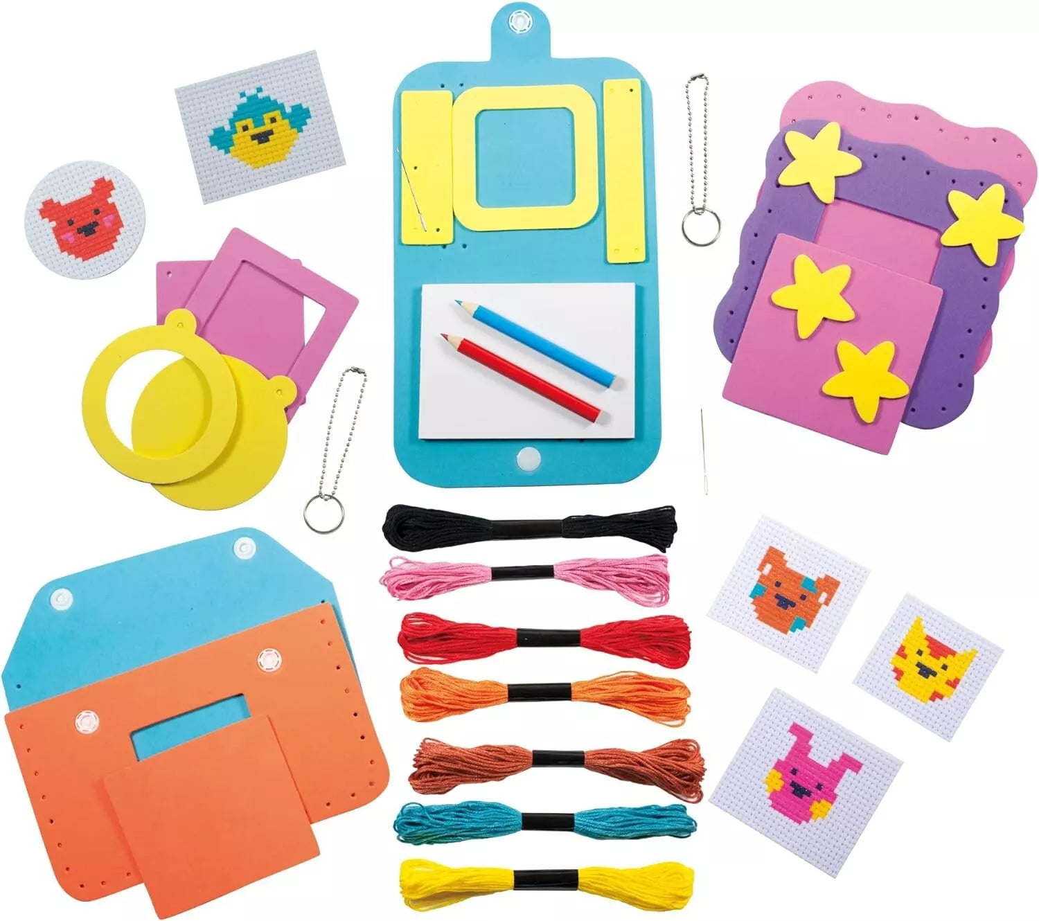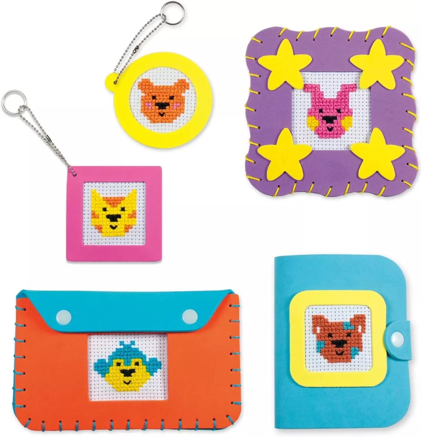 Make a monkey pencil case, puppy notepad, bunny frame and teddy and cat keyrings Cross stitch the animal faces, matching the thread to the coloured sections on the fabric Mount the completed pictures using self-adhesive...