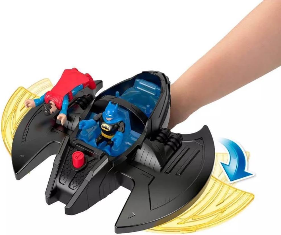 • Comes with poseable Superman and Batman figures, plus push-along Batcycle, removable Batwing, 4 disc projectiles, and 2 battle accessories