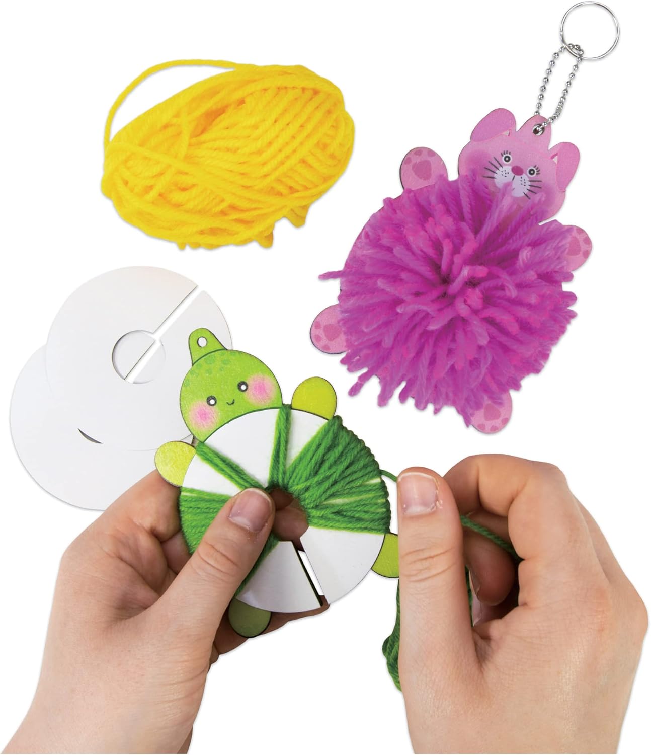 Craft adorable fuzzy friends by circling thread around the animal model and cut to make a fuzzy ball. Add a keychain! This package has material for 4 pom poms. 4 wooden models, 4 wool coils, 4 cardboard rings, 4 keyrings and chain and instructions.