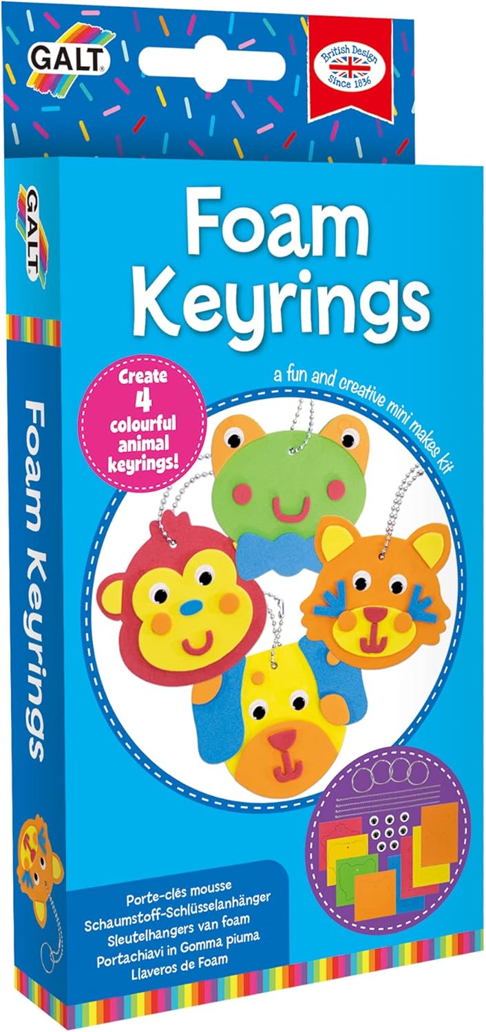 Make 4 colourful animal key chains. This product comes with all you need: a pre-cut foam rubber sheet, 4 metallic key chains, 8 eyes and instructions. The finished keychain is 6,5 x 6,5 cm. The keychain can be attached to keys or to backpacks or bags. This key chain product is recommended for children over the age of 5. Fun way to spend time on a rainy day or at the summer cabin