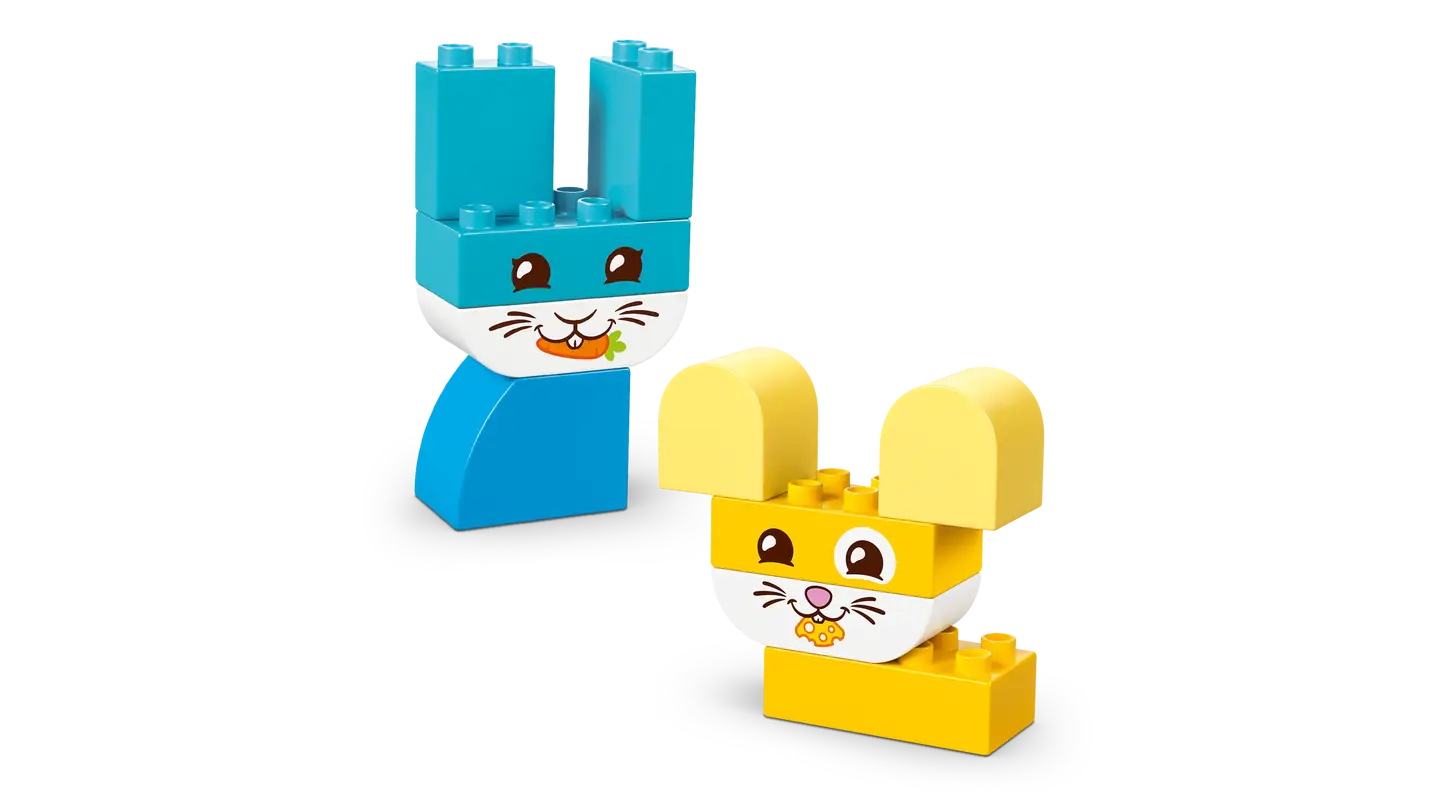 Fill playtimes with color and creativity with the LEGO® DUPLO® My First 3 in 1 Creative Cute Pets (10477) animal toy. This cute pet toy for kids ages 18 months plus offers 8 different building options with the same set of bricks. Using the 24 easy-to-handle bricks designed especially for the smallest kids, little builders can choose to make dog, cat, bird, rabbit, mouse and fish buildable figures. Some of these animal toys for young kids use single-colored LEGO DUPLO bricks. Little builders can learn to sort by color to create their pet, finishing their figure by adding a friendly animal face. Packed with toddler learning activities, this small gift for young kids encourages toddlers to develop focus and perseverance as they try out the different brick choices to select the correct bricks to complete the animal. Or they can use their creativity to construct an imaginary creature of their own invention! Contains 24 pieces.