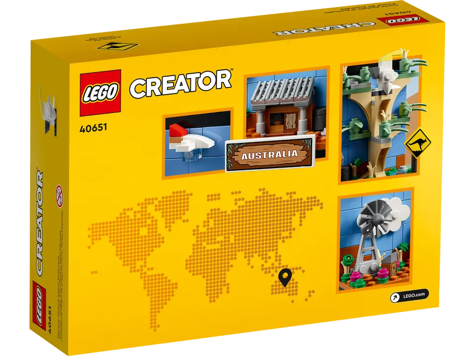 • Enjoy the sights – LEGO® Australia Postcard (40651) features some of the outback’s most famous sights: a shed, windmill, eucalyptus tree, desert flowers and a cockatoo