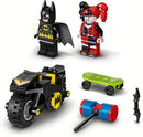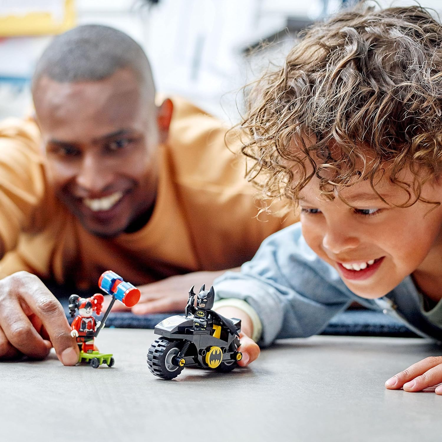 • This LEGO DC 4+ Batman building toy for kids includes 2 movie figures: Batman with Batcycle toy motorbike and Harley Quinn with a skateboard