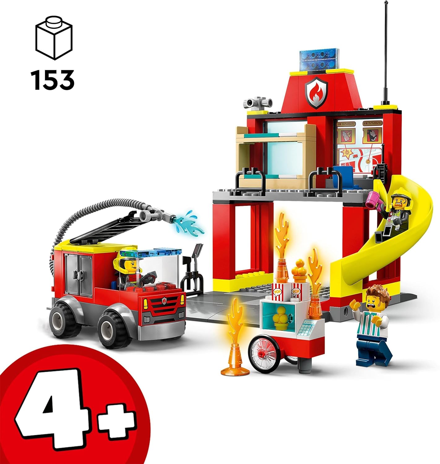 LEGO City 4+ set featuring Fire Station and Fire truck toys with flexible hose and raisable ladder, plus awesome minifigures and accessories This fire station playset features sleeping quarters, garage and emergency slide for kids...