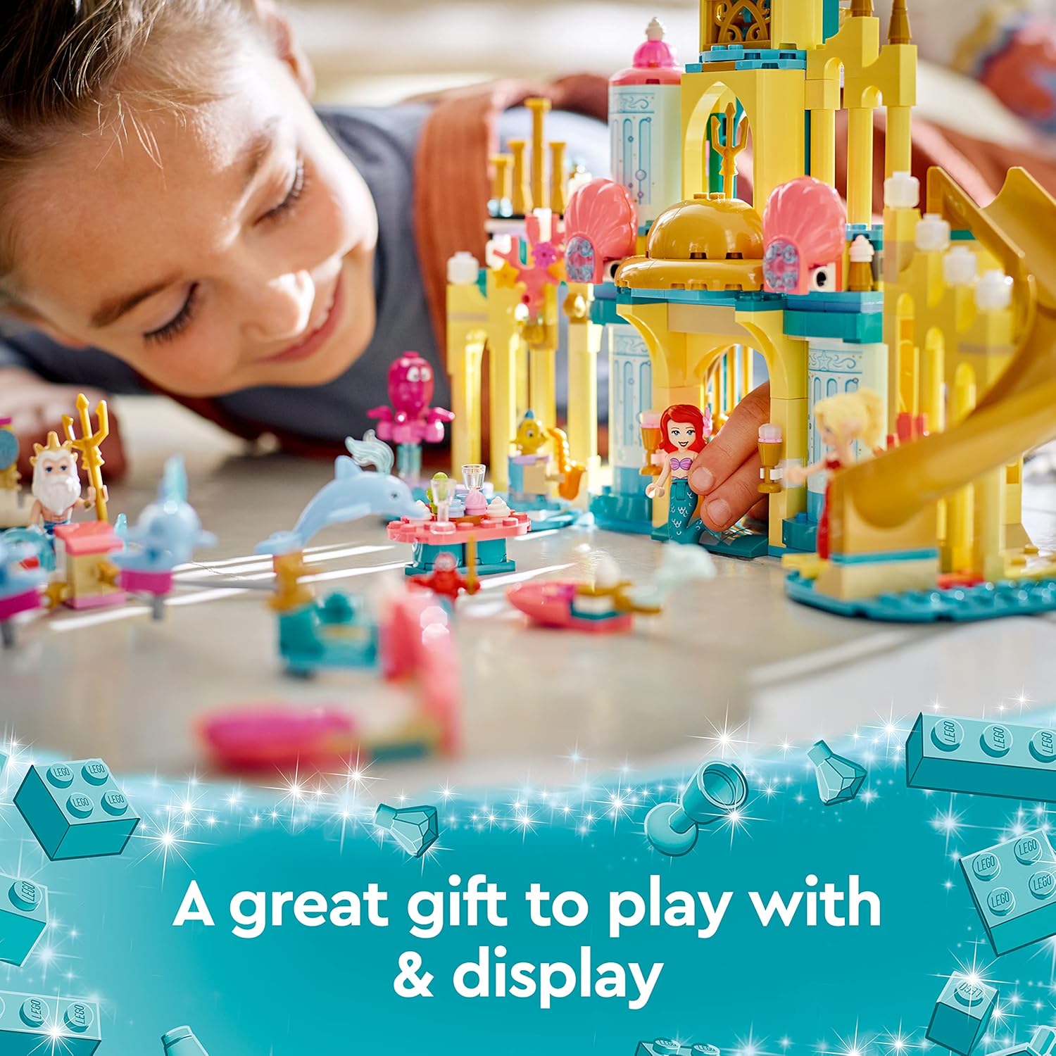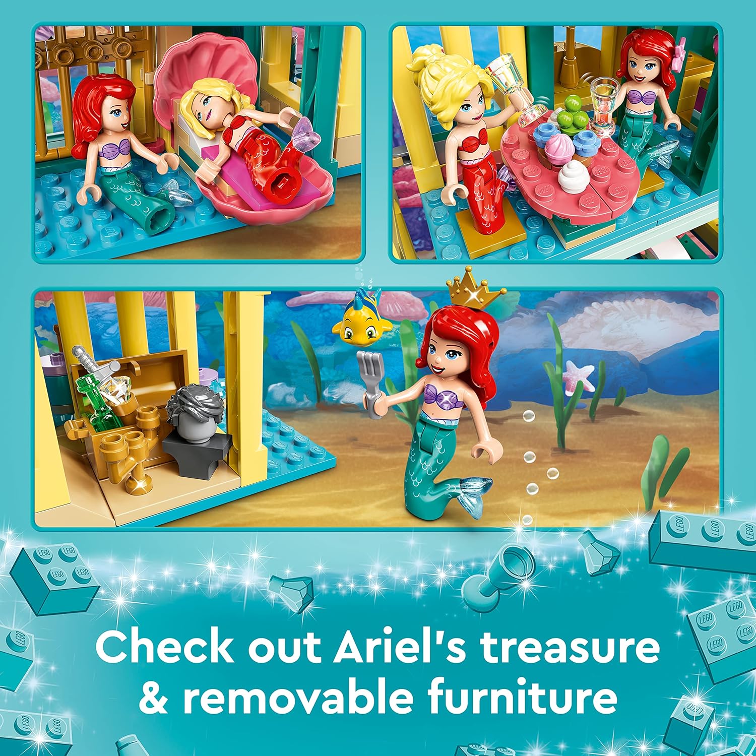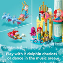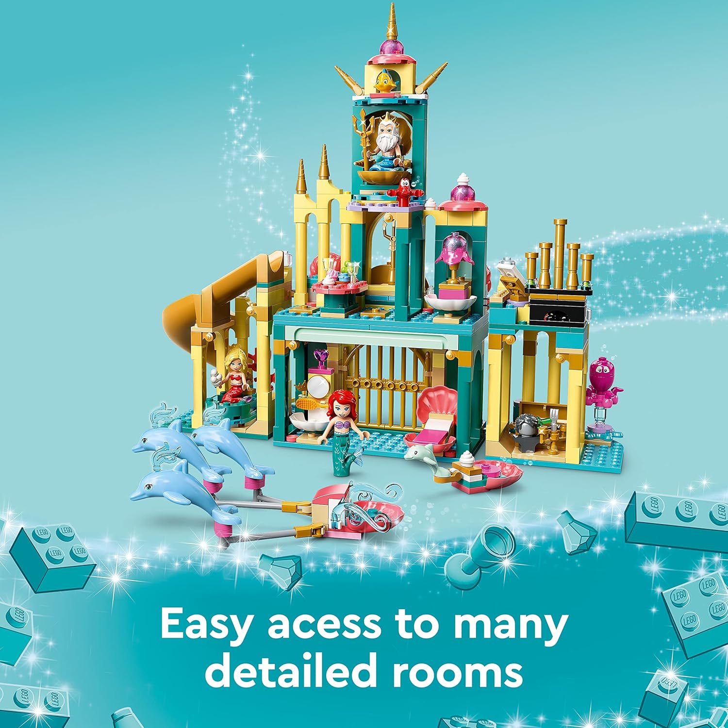 Features a LEGO Disney Princess The Little Mermaid buildable castle toy with a slide, movable furniture and large and small dolphin chariots, plus accessories Kids can listen to Sebastian play in the music area as...