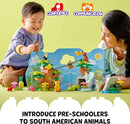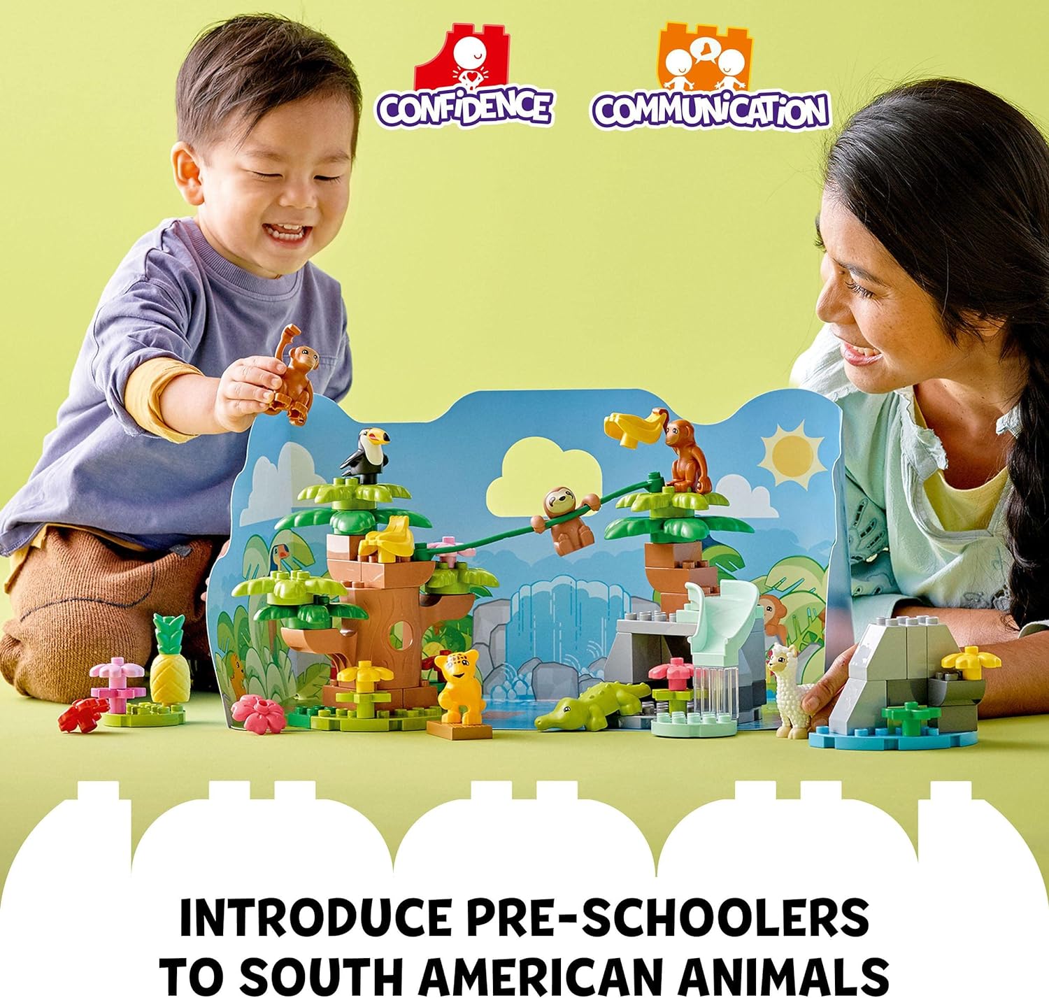 This LEGO DUPLO animal toy for toddlers aged 2 + features 7 cute animal figures in a 3-dimensional jungle playmat environment for wild playtimes Includes animal figures: crocodile, 2 toy monkeys, a sloth, baby jaguar,...