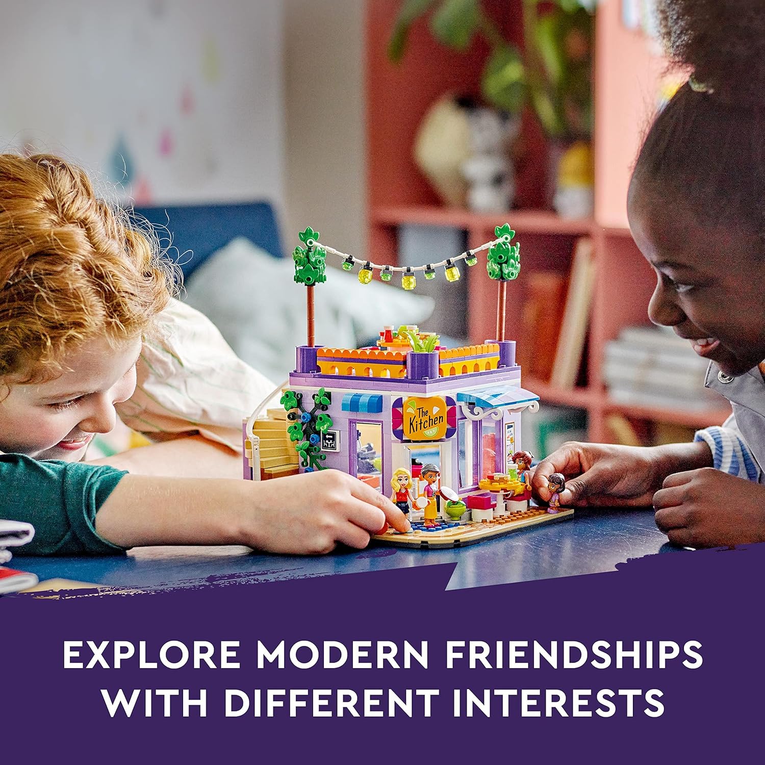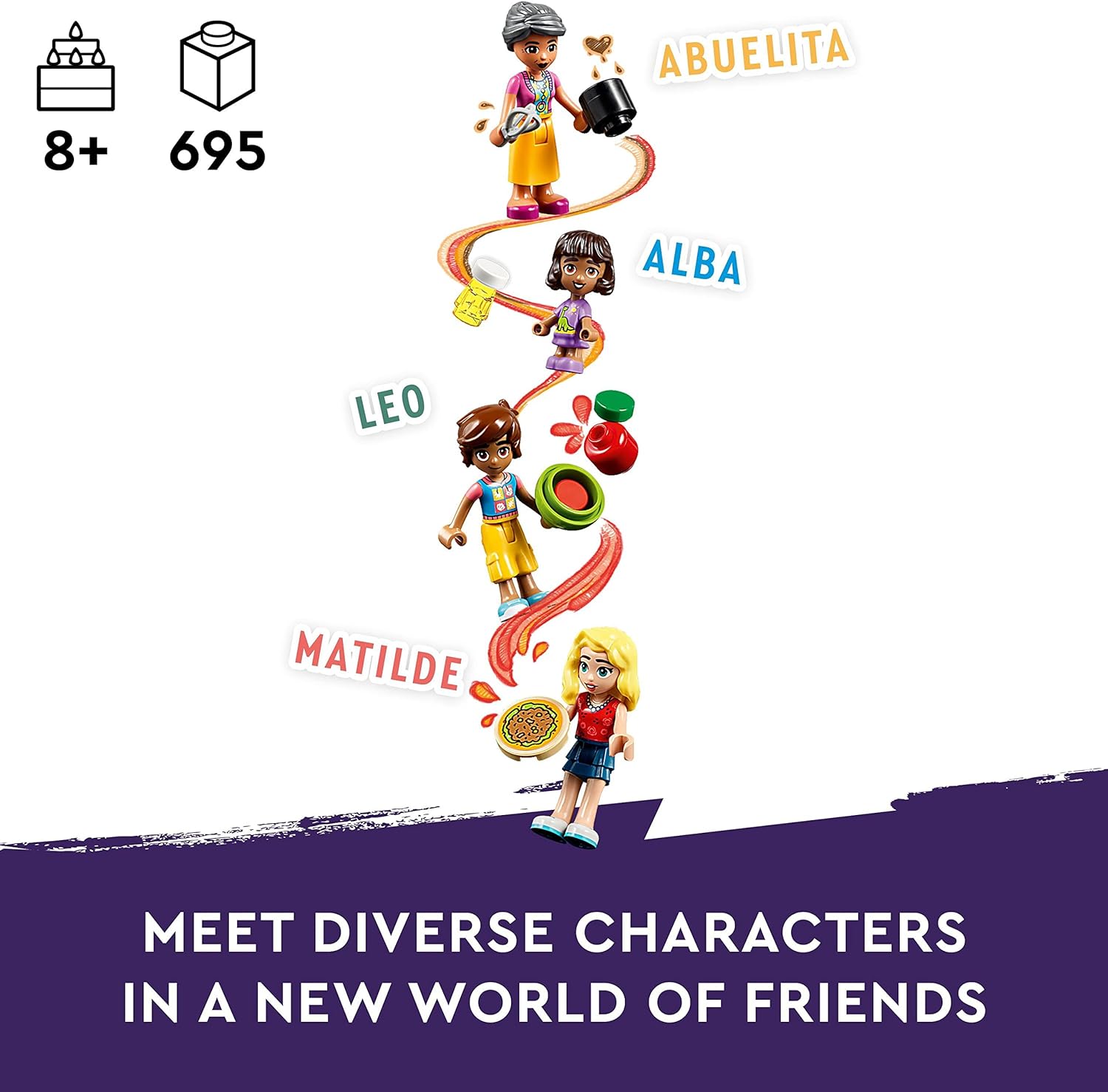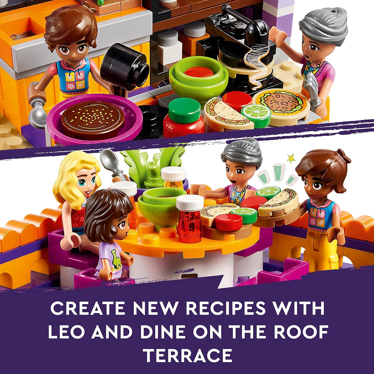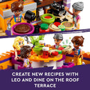 The LEGO Friends Heartlake City Community Kitchen playset features a roof terrace, outdoor seating area and toy kitchen with lots of accessories Features LEGO Friends Leo, his sister Alba and Grandmother Abuelita plus customer Matilde...