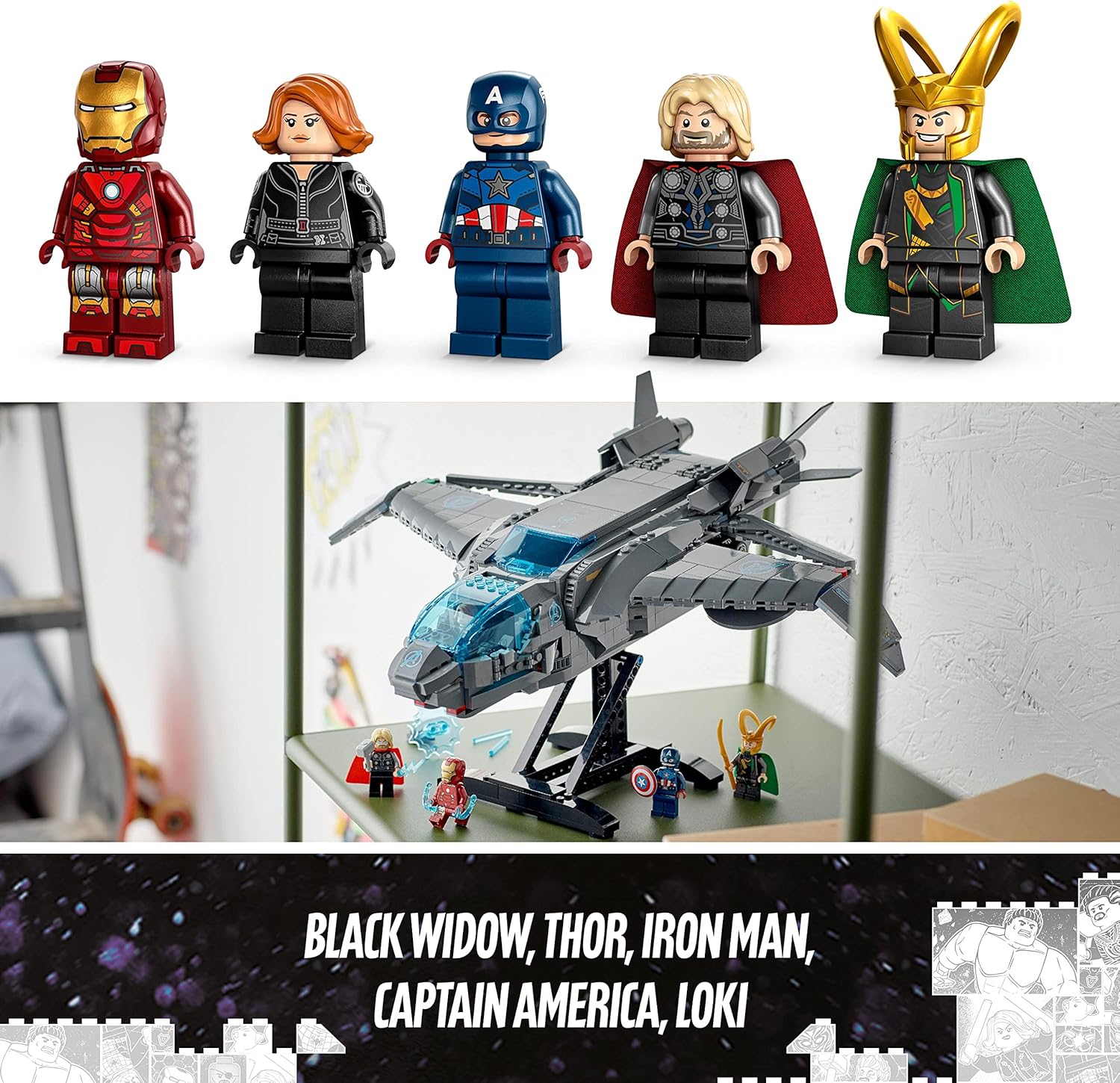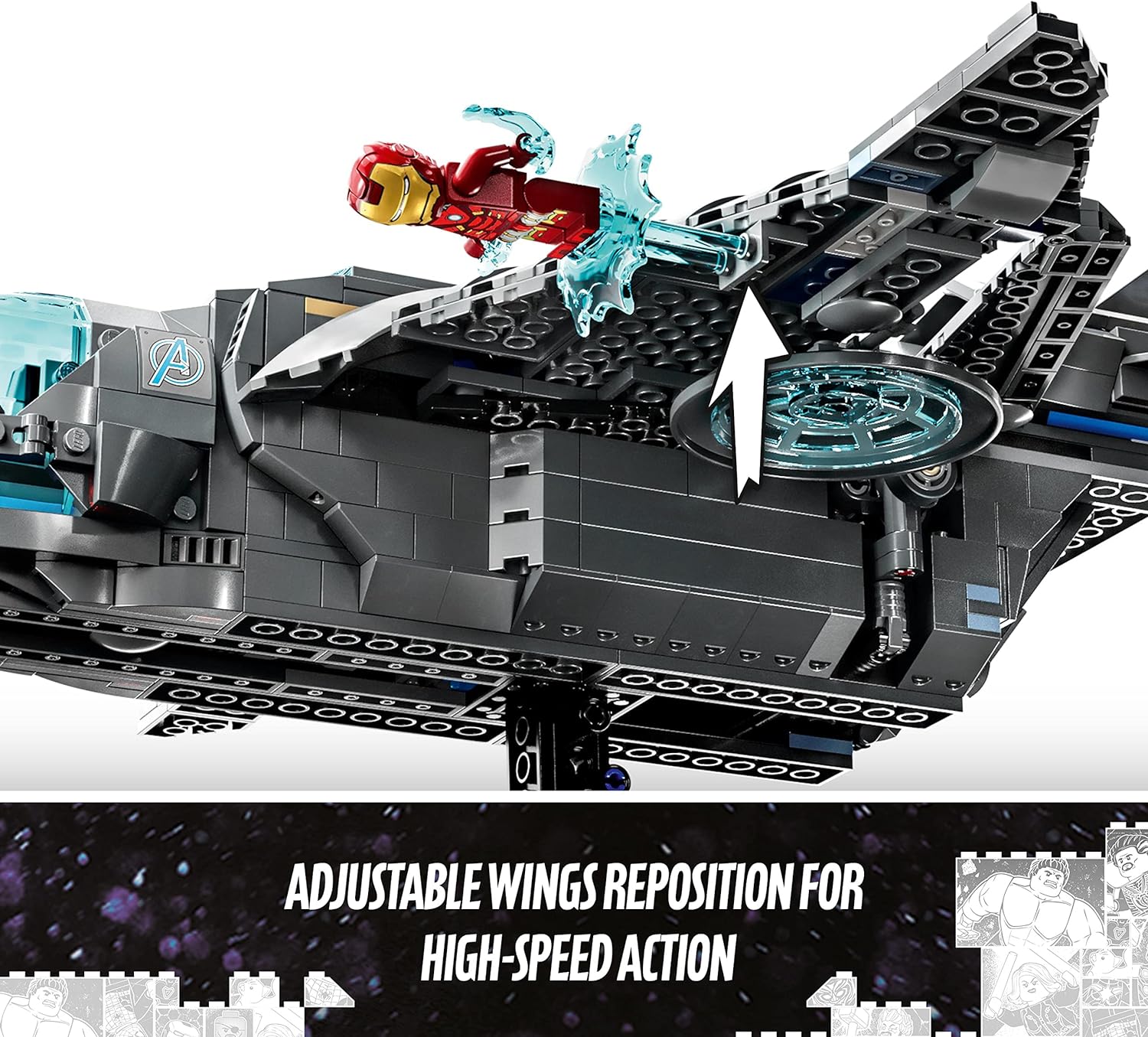 LEGO Marvel The Avengers Quinjet model building toy features an authentic recreation of the legendary Super Hero aircraft with iconic characters The collectible Avengers spaceship features an opening cockpit, passenger area, rear section, a retractable...