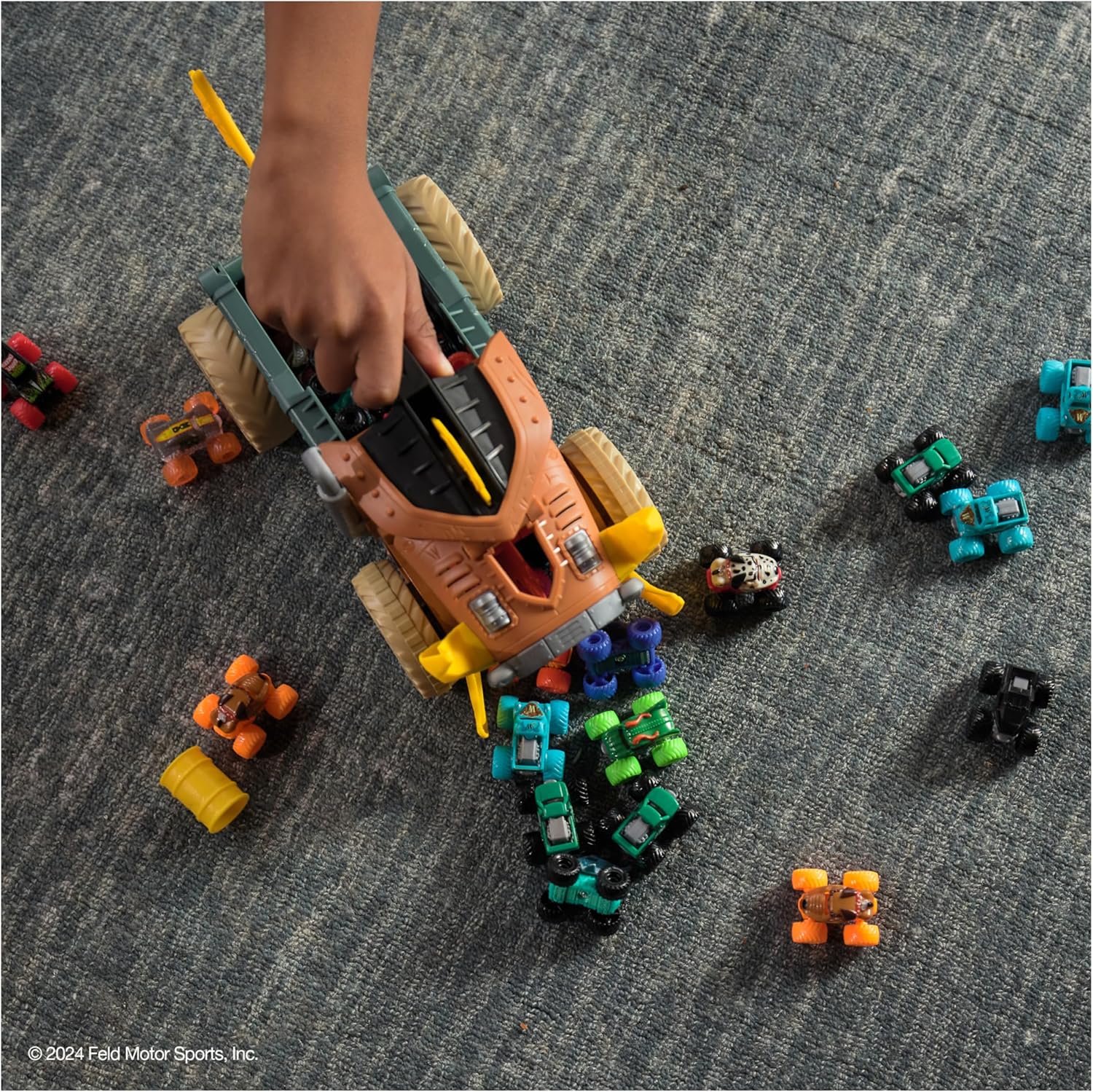 MAD HOG CHOMPING ACTION: Experience the excitement as the giant Megalodon Mad Hog chomps down and picks up any Mini Jams trucks and barrels in its way INCLUDES MEGLAODON TRUCK AND BARRELS: Includes 1:87 scale...