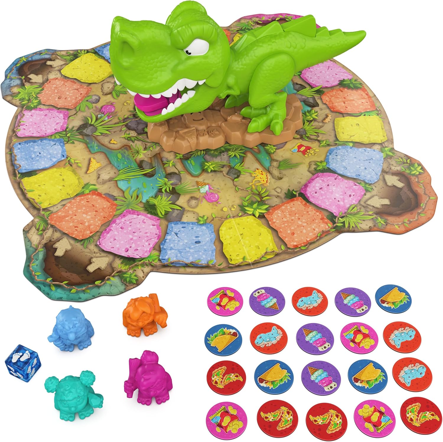 • HUNT AND GATHER FUN: Gather 2–4 players aged 5+ who love snacks, jungle adventures and dodging dino tongues to collect the yummy snacks along their path, like tasty taco-dactyl and prehistoric pizza