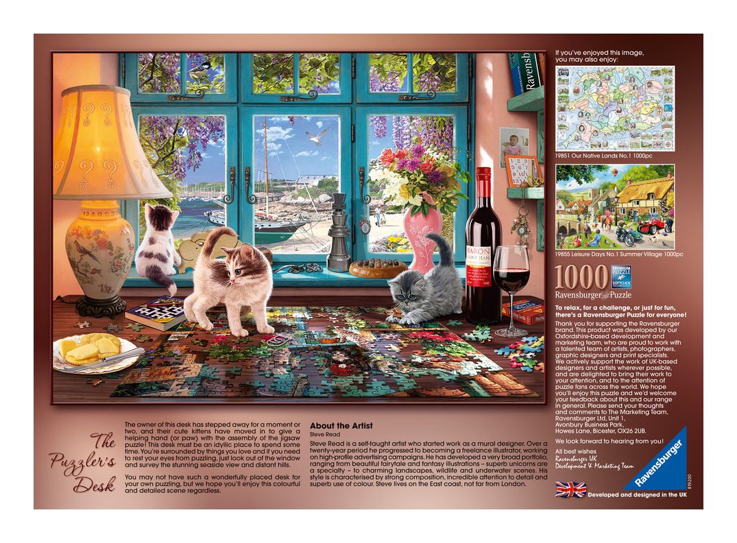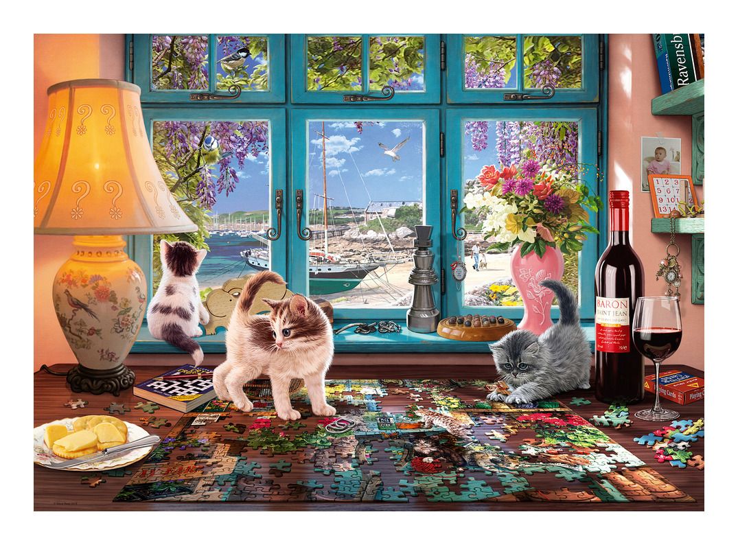 The owner of this desk has stepped away for a moment or two, and their cute kittens have moved in to give a helping hand (or paw) with the assembly of the jigsaw puzzle! This desk must be an idyllic place to spend some time. You’re surround by things you love and if you need to rest your eyes from puzzling, just look out of the window and survey the stunning seaside view and distant hills. Created by Steve Read, who lives on the East Coast, not far from London. Our 1000 piece jigsaws are crafted with premium quality materials and measure 70 x 50cm when complete. Great for Adults and ideal puzzles for Children 12 years old and up. Fully complies with all necessary UK and EU testing standards. This product is made of FSC®-certified and other controlled material. By choosing this product, you are supporting responsible management of the world’s forests. Bestselling puzzle brand worldwide - With over 1 billion puzzles sold, our jigsaw puzzles make ideal gifts for women, great gifts for men and fit perfectly on our puzzle board. Our puzzles use an exclusive, extra-thick cardboard combined with our fine, linen structured paper to create a glare-free puzzle image and give you the best experience possible. #Positivelypuzzling - From fun family times together to long term health benefits and day-to-day mindful moments, there are so many positives about the humble Jigsaw! They make a great birthday gift or smashing Christmas gift.