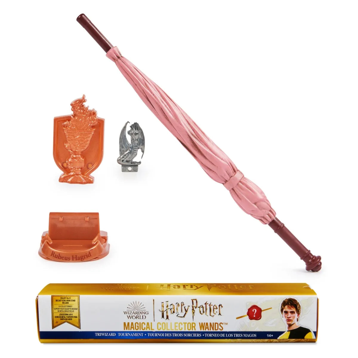 The wand chooses the wizard! This authentic 12-inch Triwizard Tournament-themed wand includes a die-cast icon and display stand! Which character’s magic wand will you reveal? Each detailed wand has a metallic bronze Goblet of Fire base with the character name and a unique die-cast accessory – butterflies with Fleur’s, a dragon with Hagrid’s umbrella wand and more! Pretend to cast spells from the Wizarding World and display the wand vertically or horizontally in the stand or in its premium box as enchanting Harry Potter decor. Collect the Magical Collector Wands from every series, including Harry, Hermione, Ron, Dumbledore, Voldemort and more (toys each sold separately)! Ages 14+. Includes: 1 Wand, 1 Die-Cast Icon, 1 Display Stand, 1 Instruction Sheet